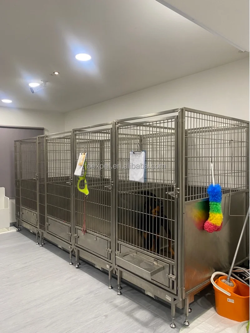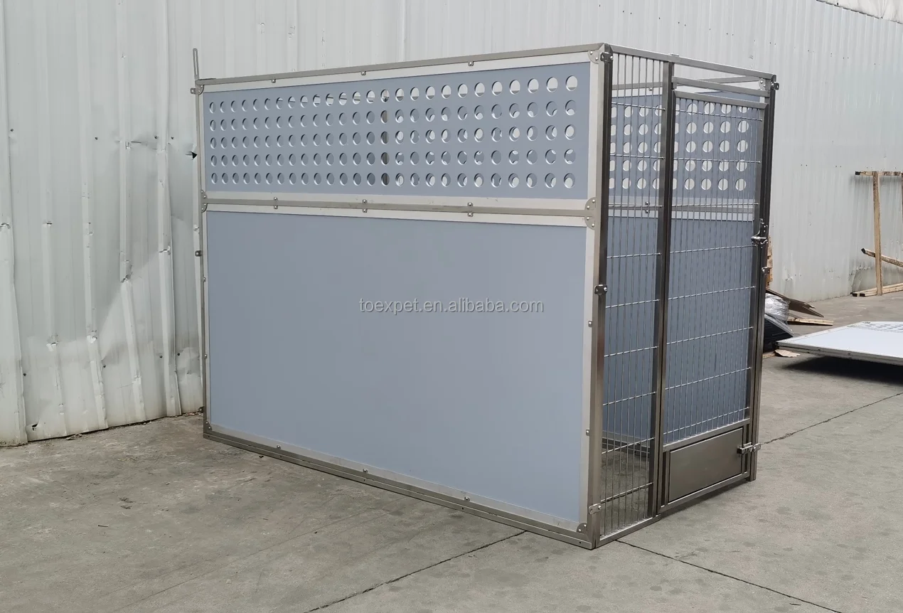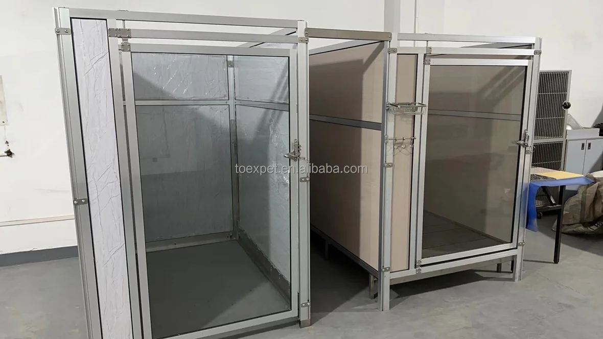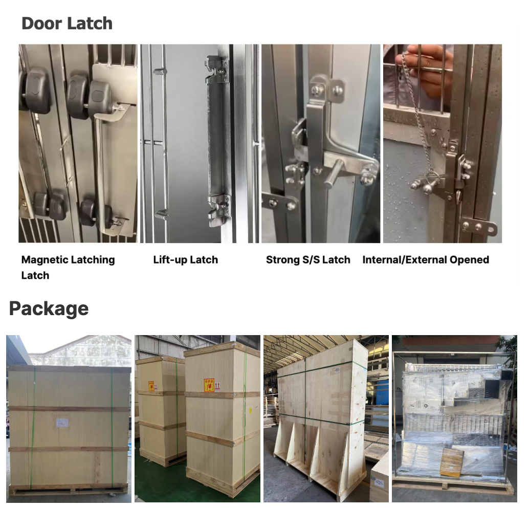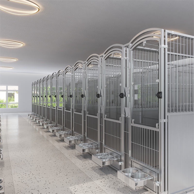 Based on our research, when using highly corrosive disinfectants like AHP (Accelerated Hydrogen Peroxide), electrochemical reactions occur between different active metals, causing the more active metal to oxidize and degrade quickly. In practical use, aluminum alloy and stainless steel are typically combined; when AHP is sprayed, the aluminum alloy part oxidizes easily, reducing the product’s lifespan. Therefore, has conducted systematic testing to ensure that only one type of primary metal frame and panel material appears in a kennel system: stainless steel with stainless steel, and aluminum alloy with aluminum alloy.